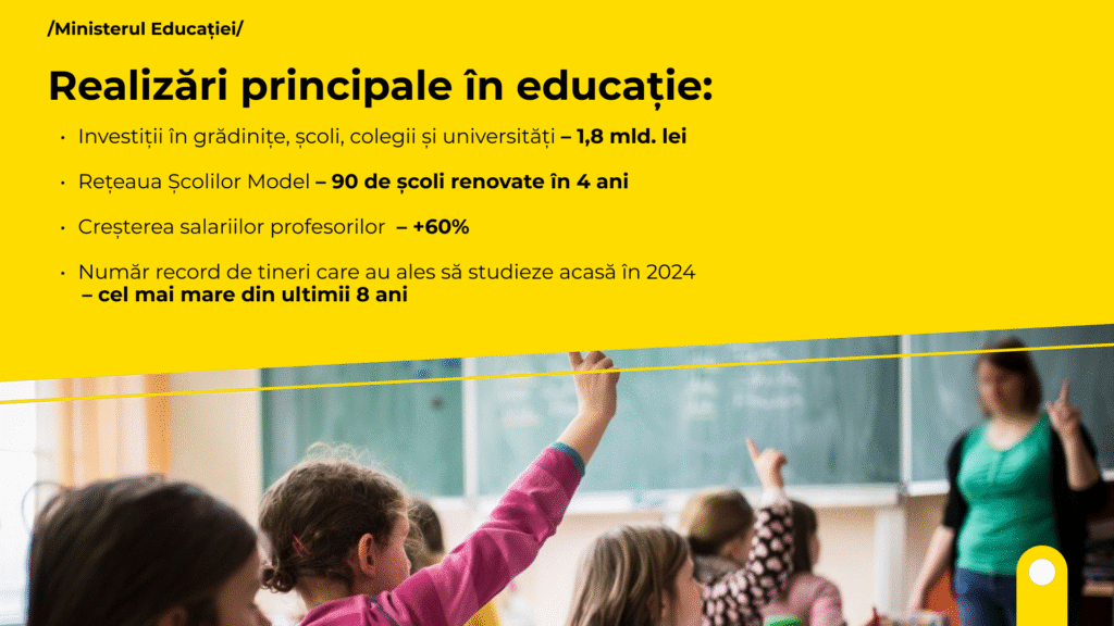 În mandatul PAS au fost investite 5,8 miliarde lei în educație și sănătate: 1,8 miliarde pentru grădinițe, școli, colegii și universități și 4 miliarde pentru sistemul medical. Am introdus mic dejun gratuit pentru elevii din clasele V–IX, am modernizat cantinele și am lansat Rețeaua Școlilor Model – 90 de școli ce vor fi renovate în 4 ani. În 2024 am avut un număr record de tineri, față de precedenții 8 ani, care au ales să studieze acasă și cel mai mare număr de profesori tineri repartizați. Salariile profesorilor au crescut cu 60%. Am redus birocrația și am investit în formarea cadrelor prin programele „Investim în profesori” și „Investim în educatori”. În medicină, salariul mediu a depășit 20.000 lei, lista medicamentelor compensatele a fost extinsă cu 40%, au fost deschise 95 de farmacii în mediul rural și implementat sistemul e-Rețeta. Spitalele au fost renovate și dotate cu cele mai noi echipamente.